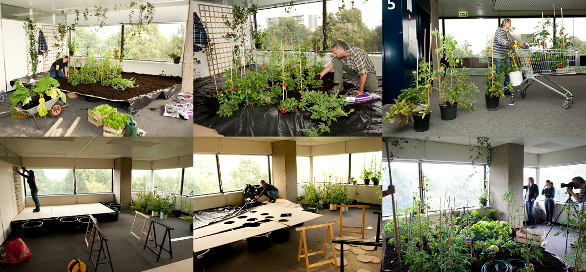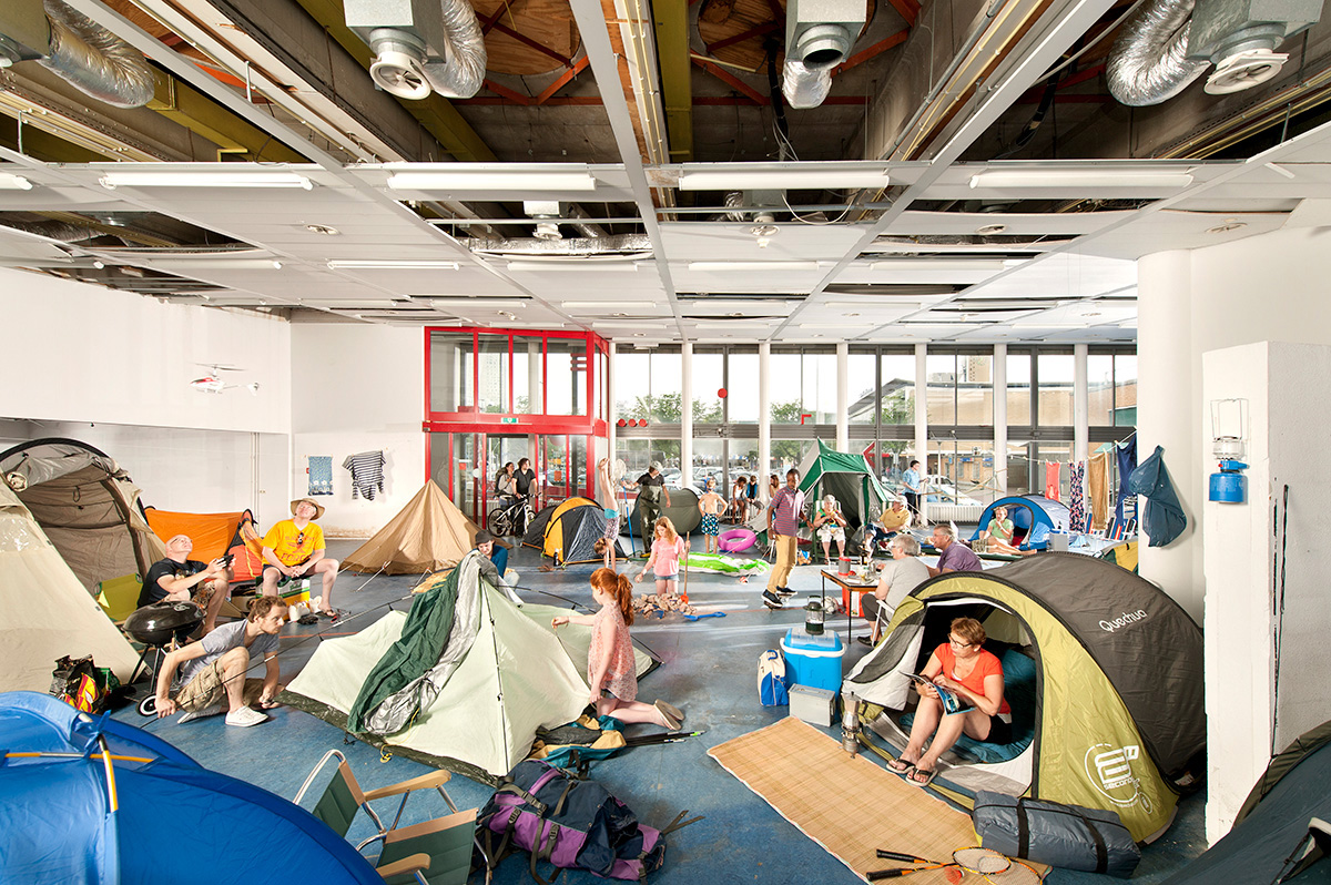 Zo creëerden we bijvoorbeeld een moestuin in de voormalige directiekamer op de vijfde verdieping van een voormalig gemeentekantoor en bouwden we een indoor-camping in het oude hoofdpostkantoor naast het centraal station.